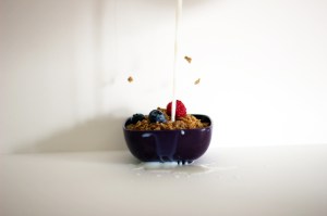 The whole picture is really crazily fake for the Grape Nuts. To recreate the “flying out of the bowl” part, I had to tie mine up with fishing line.