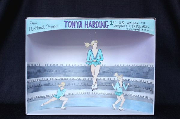 Watercolor-on-paper diorama celebrating Tonya Harding’s 1991 skate at U.S. Nationals, where she became the first U.S. woman to complete a triple axel in competition and went on to win the…