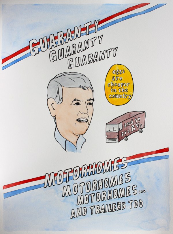 18″ x 24″ watercolor and ink on paper featuring famous local ads of my childhood. Versions in black and white available in case you want to color them yourself.