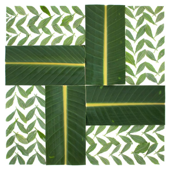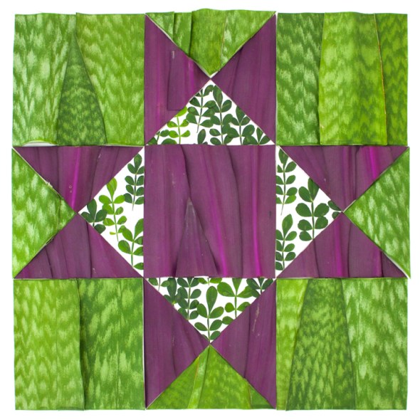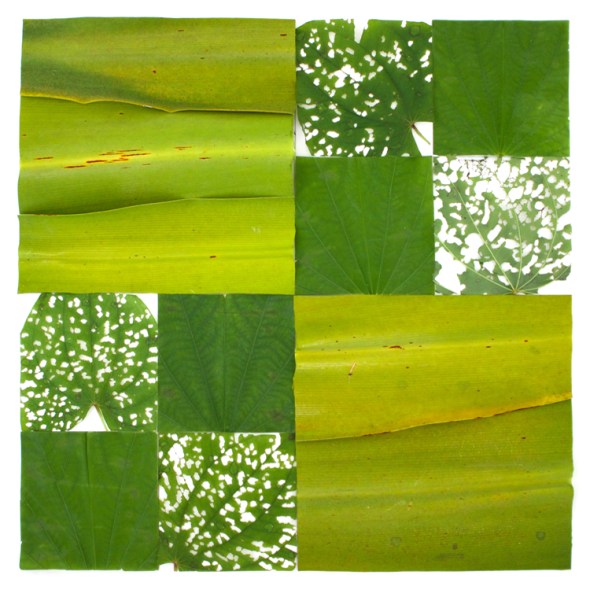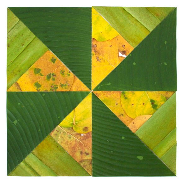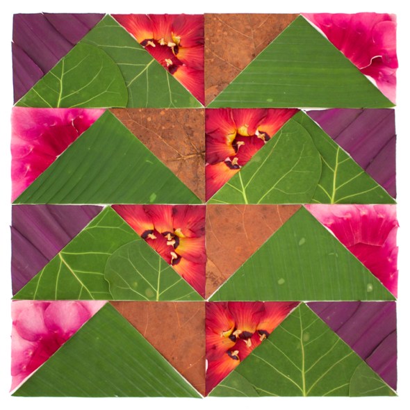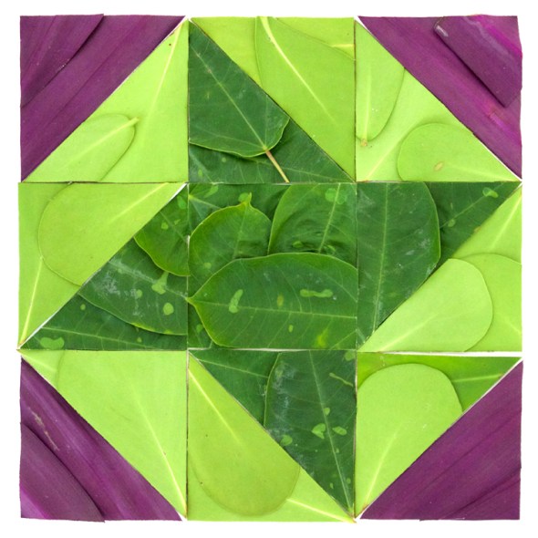 These are quilt square designs made by cutting leaves and plant parts into geometric shapes, arranging them in patterns, and photographing them before they move or die.  I made them with flora found on Robert Rauschenberg’s property on Captiva Island, Florida while attending the Rauschenberg Residency.